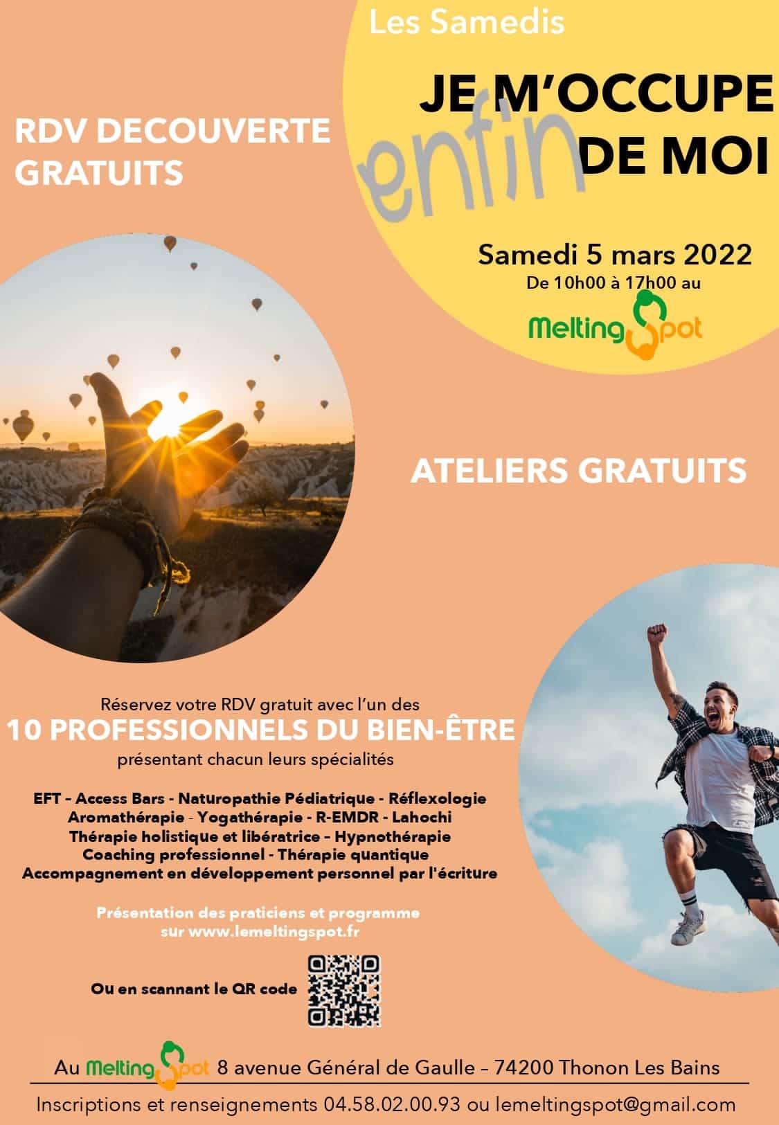 Ça y est enfin !! Samedi 5 Mars se déroulera la première journée « Je m’occupe ENFIN de moi » en partenariat avec le MeltingSpot afin de permettre au plus grand nombre de découvrir différentes pratiques du bien-être autrement appelées médecines douces ou même médecines complémentaires.